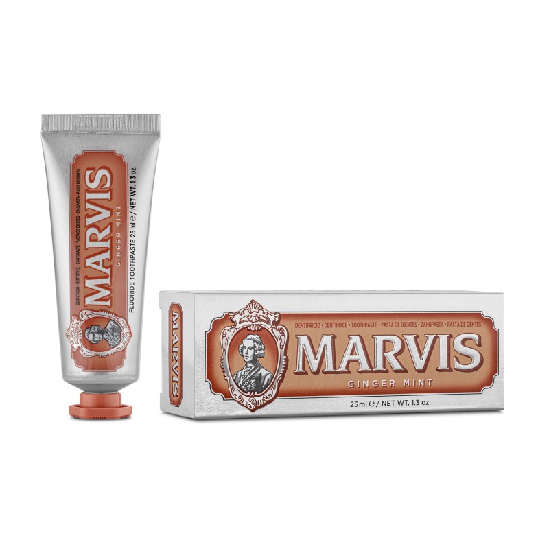 Marvis Ginger Mint dantų pasta pasižymi aštriu ir gaiviu imbiero ir mėtų aromatu. Originali Marvis dantų pastos formulė padeda sumažinti apnašų susidarymą ir suteikia gaivumo pojūtį.