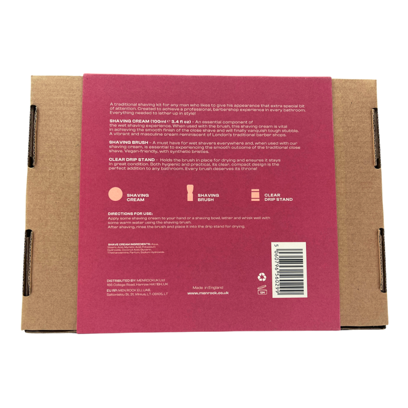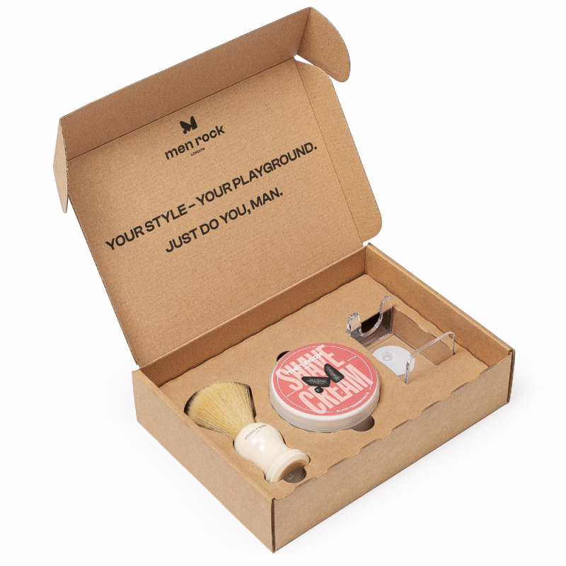 Rinkinį sudaro granatų aromato skutimosi kremas, sintetinių šerių skutimosi šepetėlis ir laikiklis šepetėliui – tai pagrindiniai produktai, kurie suteikia skutimosi malonumą.