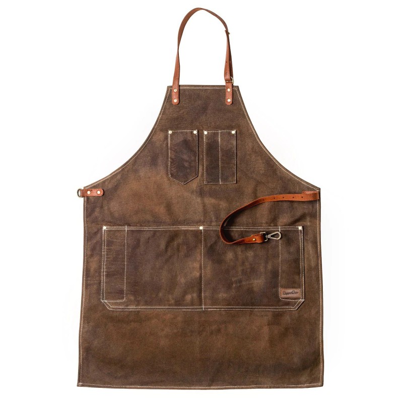 Sendinto stiliaus kirpėjo prijuostė su odiniais dirželiais ir metalinėmis sagtimis.