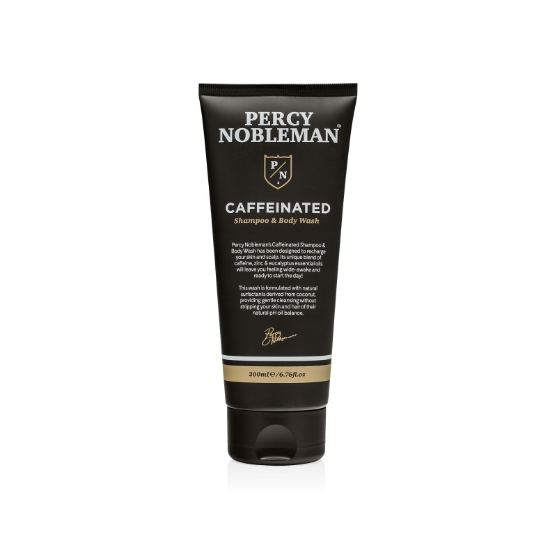 Percy Nobleman šampūnas ir kūno prausiklis su kofeinu greitai atgaivina pavargusią kūno ir galvos odą. Natūralus prausiklis su paviršinio aktyvumo medžiagomis, išgautomis iš kokoso, švelniai valo ir nepažeidžia natūralaus odos pH ir riebalų balanso.